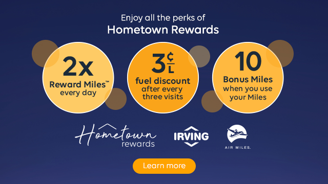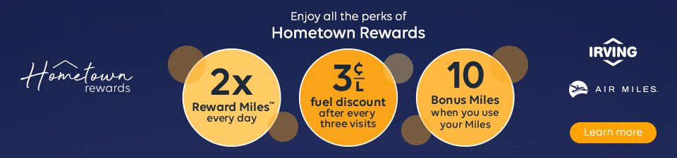 Offer valid March 31, 2026, to June 1, 2026, at participating Irving Oil locations in Atlantic Canada. If you are not already a Hometown Rewards member, you must first download the Hometown Rewards mobile application, create an account, and link your AIR MILES® collector number in the app to become a Hometown Rewards member. Hometown Rewards members will then receive 20 AIR MILES® Bonus Milesᵀᴹ when they fill-up with 35 L or more of any fuel type (regular, plus, supreme or diesel) in a single transaction. No coupon required. Only transactions made after completing the Hometown Rewards application registration steps outlined above will qualify for this offer. A valid AIR MILES® card must be swiped/collector number entered at time of transaction to be eligible. Can be combined with other offers, and AIR MILES offers. Limit of one offer per collector number per transaction. No cash surrender value. Irving Oil Retail Sales Inc. and BMO Blue Rewards, Inc. reserve the right to make changes to this offer and to terminate the offer at any time, for any reason and without notice. Void where prohibited by law. ®™ Trademarks of AM Royalties Limited Partnership used under license by BMO Blue Rewards, Inc. and Irving Oil Retail Sales Inc. All other trademarks used herein are the property of their respective owners.